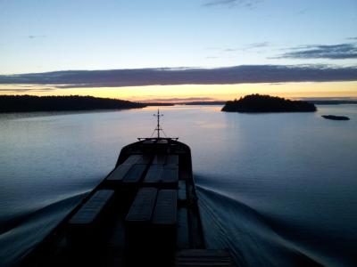 Der Lotse steuert selber, das Fahrwasser ist eng trotz des riesigen Sees. Mal eine 90, mal eine 140 Grad Wende - ich bin verbluefft, wie wendig so ein Frachtschiff ist. Es biegt um die "Kurve" fast wie ein Auto. Wenn ich denke, ich habe die Durchfahrt durch die naechsten Inseln erspaeht, zack, dann drehen wir schon wieder und laufen einen ganz anderen Kurs. Es macht richtig Spass, hier herumzukurven.