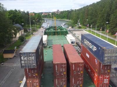 Der Maelaren! Mit einem Frachter auf einen Binnensee. Nun geht es los. Aber davor gibt es eine kleine Schleuse. Klein, genau. Sehr klein. Winzig klein. Ich weiss, das ich nicht schaetzen kann, der Lotse schon, nehme ich mal an. Wird also passen. Als wir drin sind, sehe ich keine Schleuse mehr. Wir fuellen alles aus.