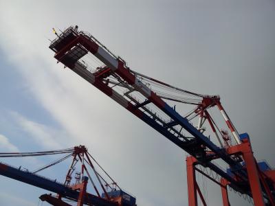 Anders kann man die riesigen Kraene nicht beschreiben. Sie ragen ja auch wie ein Hochhaus ueber uns. Eigentlich wollte ich mir das Laden direkt anschauen, aber eben hab ich es doch mit der Angst gekriegt... Da "schweben" zig Tonnen nur wenige Meter an einem vorbei. Und das in einem Affenzahn. Wenn da nur irgendein Greifer nicht haelt, bin ich platt! Und wenn der ganze Kran umfaellt? In Wilhelmshaven haben sie ja auch Probleme mit der Kaimauer...?! Uuh...ich glaube, ich traeume heute ganz schrecklich...